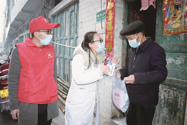 日前,鲁屯镇组织医生和村(社区)干部深入各村(社区)群众家中,为65岁及以上老年人中重点人群和次重点人群发放了由贵州省疫情防控领导小组综合组统一配发的防疫健康包,并宣传新型冠状病毒感染防治知识和最新防疫政策,讲解健康包使用方法和合理用药知识,介绍中医中药在新型冠状病毒感染预防、治疗和康复中的重要作用,指导老年人做好个人防护,切实关爱老年人身体健康。上图为鲁屯镇医务人员和村(社区)干部上门为群众发放防疫健康包。