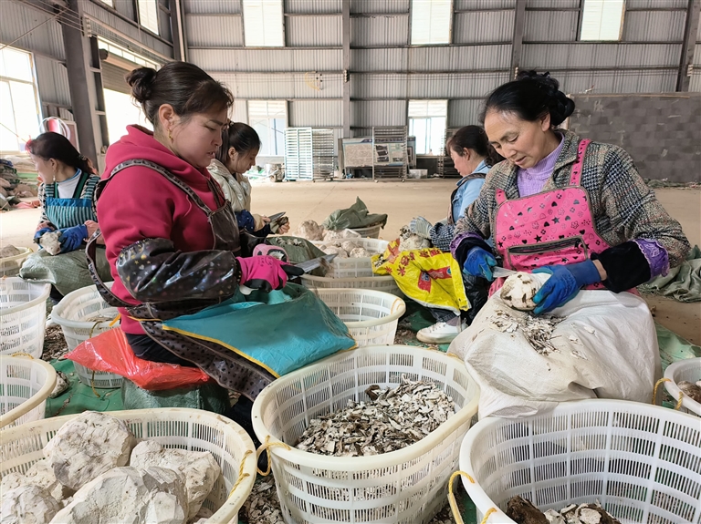 如今,合作社以“种植基地建设+中药材营销+初级加工”的模式发展,走出了一条特色产业发展路子。下一步,合作社将积极探索优化发展模式,扩大中草药的种植规模和当地药材的品牌,提高土地的经济价值,推动农村发展、农业增效、农民增收。左上图为工人在削茯苓皮。