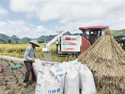 机收服务的开展,大大降低农户劳动强度,提高水稻收割效率,降低农业生产成本,节本增收效果显著。上图为村民将机收稻谷装袋的场景。